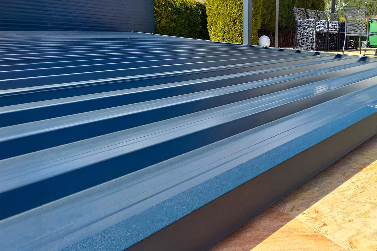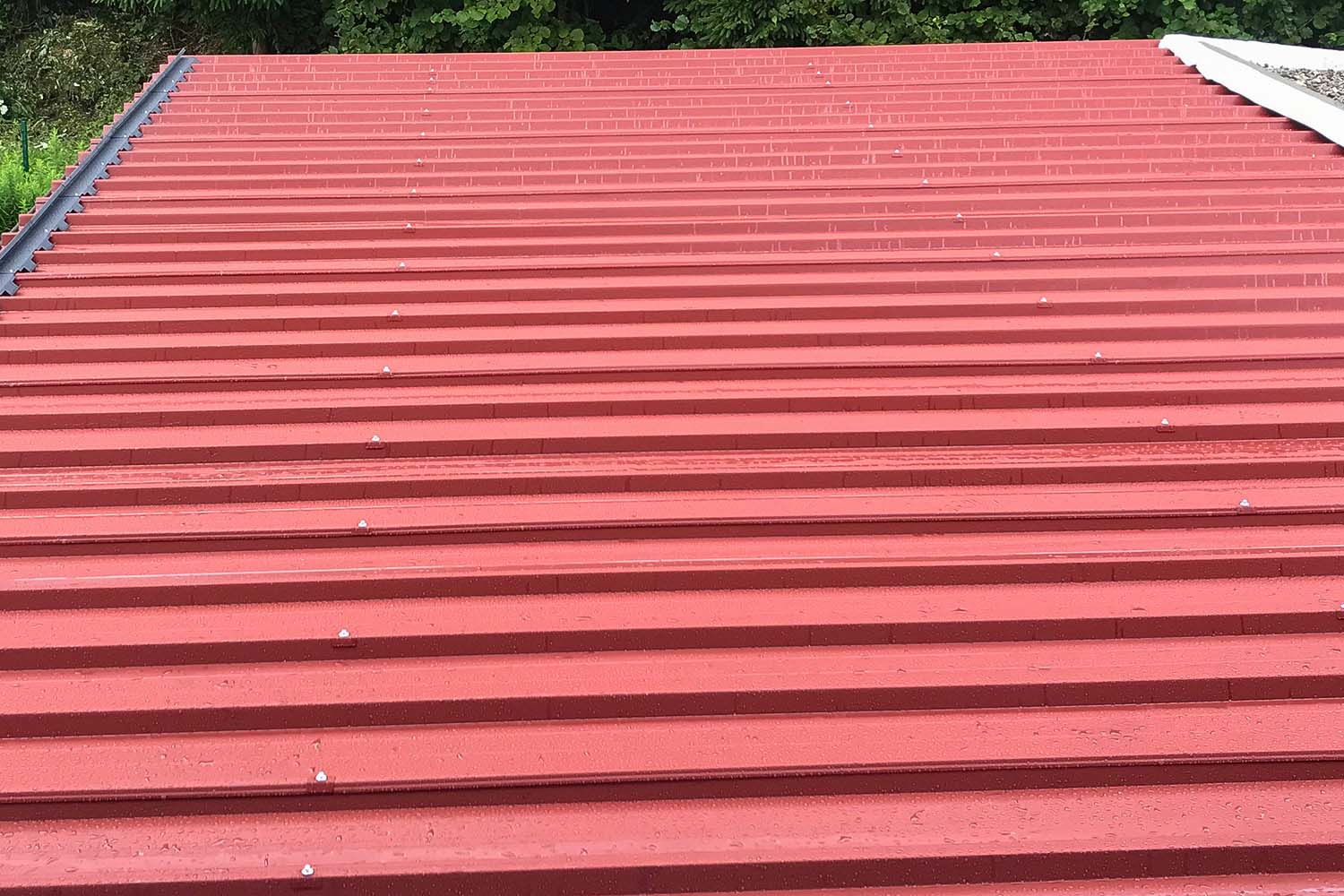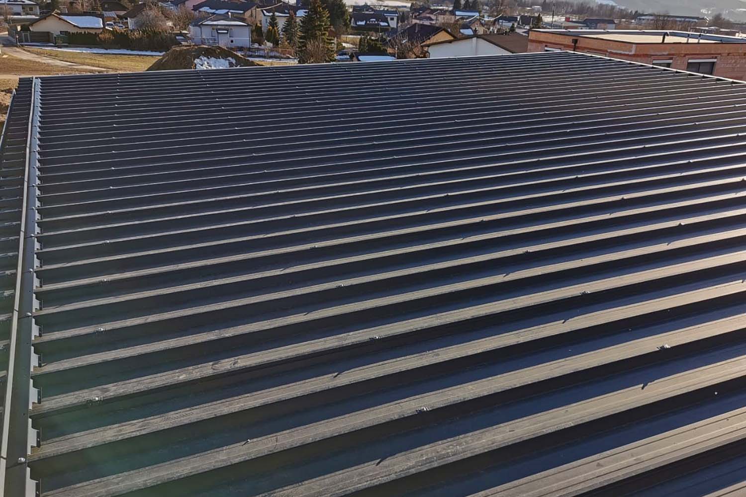 Selbsttragendes Dachpaneel mit 5 Sicken in Sandwichbauweise mit Polyurethan-Schaum-Isolierung, einer Deckschicht aus verzinktem Blech Lackiert nach RAL-Farbe und einer abziehbaren PE-Schutzfolie.